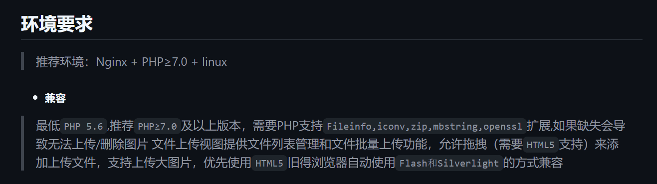 Nginx + PHP≥7.0 + linux,且PHP安装Fileinfo、iconv、zip、mbstring、openssl扩展!