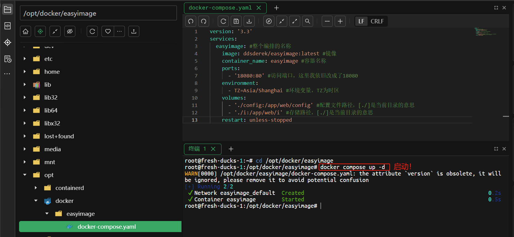 选一个你想存放的路径,例如:/opt/docker/easyimage,将上面的命令保存成 docker-compose.yaml 文件